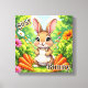 En bedårande bild för ett barns rum. En söt tecknad kanin som är upptagen med att arbeta i sin trädgård med morötter och sallad.