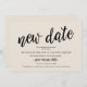 Detta är ett bröllopsannonseringskort för uppskjuten bröllopsdag, med kortets titel, Nytt datum, i svart scriptfont, modern rustik design med krämtema.