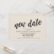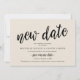 Detta är ett bröllopsinbjudningskort för uppskjutet bröllop med kortets titel, Nytt datum, i svart scriptfont, modern rustic-design med krämtema.