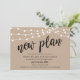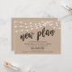 Detta är ett bröllopskort för uppskjuten bröllopsfest, med kortets titel, Ny plan, i svart scriptfont, modern rustic kraft farm, strängljus, designtema.
