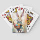Uppspelningskort med en glad kanin i en blå apparat som bär på en basket fylld med färgstarka, dekorerade ägg. Bakgrunden innehåller information om mjuk blommigt och varm färg.