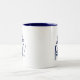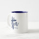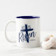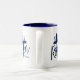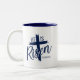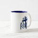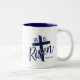 Kaffemuggen visas i marinblått och vitt med ett Han är Uppstånden tryck.