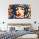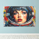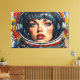 Otis Porritts digitala konstverk presenterar en slående närbild av en kvinna i en astronauthjälm, renderad med en dynamisk Pop Art-estetik. Hennes genomträngande blå ögon och livfulla röda läppar fångar uppmärksamheten, medan hennes ansikte är prytt med ett mönster av röda Ben-Day-prickar som härmar seriebokstryck. Kraftiga svarta konturer definierar hennes drag och de gula och vita hjälmens konturer. Bakgrunden, en livfull blå med grafiska utbrott och rasterpunkter, förstärker den energiska, retro-futuristiska stämningen i denna fängslande porträtt.