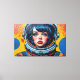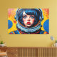 Otis Porritts digitala konstverk presenterar en slående närbild av en kvinna i en astronauthjälm, renderad med en dynamisk Pop Art-estetik. Hennes genomträngande blå ögon och livfulla röda läppar fångar ens uppmärksamhet, medan hennes ansikte är prytt med ett mönster av röda Ben-Day-prickar som härmar seriebokstryck. Kraftiga svarta konturer definierar hennes drag och de gula och vita hjälmens konturer. Bakgrunden, en livfull blå med grafiska utbrott och rasterpunkter, förstärker den energiska, retro-futuristiska stämningen i denna fängslande porträtt.