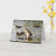 En brun anka som spännande flapping dess vingar och "dansar", stunder tre andra ankor simmar calmly, närliggande, är subjekt av mitt "UPPVAKTAR HOO! Så lyckligt för dig!", hälsningkort. Jag fångade denna plats längs shorelinen av den härliga sjöwinnebagoen i Quinney, Wisconsin.