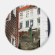 Bild av en ensam läsare gömt mellan röda och vita trähus i ett gammalt stadsdistrikt i Bergen, Norge.