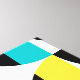 Abstraktens bakgrund mönster med geometriska former (cirkelformade och rektangulära) i gult, blått, rött och svart färg. Modern, enkel, lekfull och livfull vektorkonst.