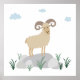 Urial Bergsfår Väggkonst för Barnkammare med en charmig illustration av ett vilt Urial som står på stenar med gräs. Perfekt för barnrum, barnkammare eller lekrum med berg, natur eller skogsteman. Ett mjukt och pedagogiskt konstverk som firar vilda djur och tillför skandinavisk charm till barnens utrymmen.