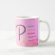 Mugg kommer att vara en favorit för alla från din mormor till din tonårssyster. Med högernas budskap kan ett mugg bli någons skattade följeslagare till komen i åratal. Den här designen har en vacker, handdragen "P" från brev i svart kursiv stil på en fantastisk vattenfärgsbakgrund. Den lämnat sidan visar en varm övertoning mellan gult och rosa, medan högerna visningar en mjuk övertoning mellan rosa och gult. Området kring brev är vibrerande ord i olika färg, inklusive blått, orange, rött, lila och rosa, vilket belyser positiva egenskaper som börjar med brev P. Den övergripande effekten är en visuellt tilltalande och upplyftande design som firar skönheten hos brev P och dess egenskaper. Vattenfärgsbakgrunden tillför en smula elegans och sofistikering och skapar den här perfekten för inspiration eller motivation.