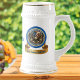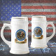 This customizable US 250th-anniversary commemorative ceramic German-style beer stein is a keepsake you and your family will treasure for years. Featuring a unique decorative American seal, it’s a standout addition to any collection and a thoughtful gift to be remembered. Its timeless design includes the years of celebration and the words “We the People,” a detailed blue-and-gold seal, a cross with the American flag, and a bold eagle flanked by two star-adorned shields. The words faith, freedom, 250 years, and 1776–2026 encircle the design. A golden banner with space for personalization—whether a first name, last name, or both—completes this collector’s piece.