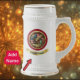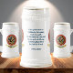 This commemorative German-style beer stein showcases a proud, vintage, and whimsical seal—a small yet mighty symbol of resilience—gazing toward the next chapter of American freedom. The quote at the center is a touch of the celebration. A red ribbon encircles the design, adorned with flowers, the American flag, a cross, a bold eagle, the Statue of Liberty, and the words “Celebrating America” with the years alongside. A golden banner adds the perfect finishing touch, ready to display your family name or the name to whom this stein will be given and received with much gratitude. As a collector’s piece, it’s a must-have, and as a family heirloom, it speaks to American faith and endurance.