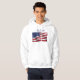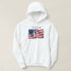 Comfy white cotton sweatshirt with hoodie. Wear with American pride. The flag is flowing with it's stars and stripes in the wind. To be lived in. Available in different styles (t-shirts) and colors. Also available in women's t-shirts.