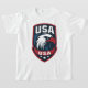 Ett djärvt emblem för merch-redo med ett starkt örn i en modern sköld med "USA", tre stjärnor och en ren rödvit palett. Med vektorformer och vass kontrast kan du lägga den på kläder, klistermärken, mugg, hattar och poster. Levereras på en genomskinlig bakgrund så att du enkelt kan placera den på vilken färg som helst. Perfekt för lag, turneringar, skräddarsydda program och Independence day-pride.