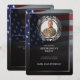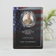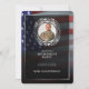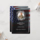 Personligt foto dekorerat med silver lagerblad och en silverram på en strålande amerikansk flagga som fladdrar mot en svart bakgrund. En elegant pensioneringsfestmall med foto som är enkel att redigera. Denna lyxiga design är lämplig för veteraner, militärer, polis, statliga jobb eller jobb relaterade till patriotism.