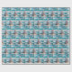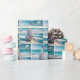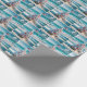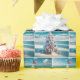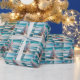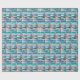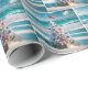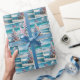 En vit julgran dekorerad med blå och röda dekorationer står på en sandstrand, med en amerikansk flagga på toppen