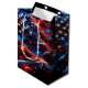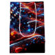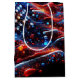 En livfull framställning av den amerikanska flaggan med virvlande mönster i rött, vitt och blått, med stjärnor mot en dynamisk bakgrund