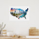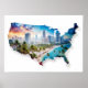 Bilden visar en representation av kreativet i Förenade Stater karta med olika berömdar och landskap som läggs ovanpå i gräns.