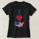 En söt kvinnas t-shirt för alla som kärlekar USA. Med en unik bild "I Kärlek USA" eller "I Heart United States of America" som går vertikalt ned i mitten med en karta i USA fylld med den amerikanska flagga. Underbar för att du stöder ditt favoritprogram land vid patriotiska evenemang som amerikanska nationella idrottslag eller möten. För stolta amerikaner och alla som kärlekar USA.