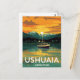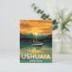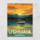 Capture the majesty of the "End of the World" with this stunning vintage-style travel postcard for Ushuaia, Argentina. The artwork features a dramatic sunset over the Beagle Channel, with a fishing or expedition boat floating on the reflective water, framed by snow-capped mountains and the lights of the southernmost city. This design is perfect for South American travel enthusiasts, Antarctic expedition planners, fans of retro travel art, and anyone captivated by remote, dramatic landscapes. A unique souvenir from Tierra del Fuego.