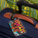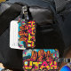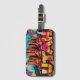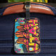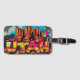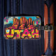 Bagagelapp från delstaten Utah, USA med en stor UTAH-text i gult rosa, framför en abstrakt Monument Valley och Wasatch-bergen.