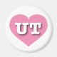 Den här magneten har en lugn, coola rosa hjärta som innehåller fet, vit, övre fodral brev UT, officiellen förkortning för Utah, bikupans tillstånd.