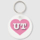 Den här nyckelkedjan har en lugn, coola rosa hjärta som innehåller fet, vit, övre UT för fodral, officiell, förkortningen för Utah, bikupans tillstånd.