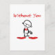 Visar en söt men ledsen stick figur med ett brutet hjärta, med en viltad blomma och orden "utan dig" med röd text ovan. Mannen står över två röda, brutna hjärtan. Anpassa om du vill lägga till text på baksidan. Söt och fin. Säg "jag saknar dig" med den här designen, för Valentines day den 14 februari, när du är separerad genom avstånd, eller när du är på andra tillfälle, som till exempel en födelsedag eller helgdag.