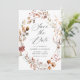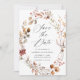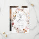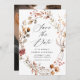 Elegantens falltema sparar datumet med vattenfärgade höstblommor och löv i röda, oliv grönt, orange och bruna nyanser. "Spara datumet" visas i ett modernt kalligrafiskript med information om namn och bröllop som visas nedan. Kortets baksida visningar fullt utfallande bild av lodräts förlovning. Fallkoordinaterna sparas med blommigten Rustic Autumn Blommigt bröllop.