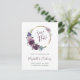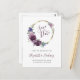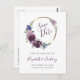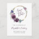 Den här boho sparar datumet på vykortet med en lila vattenfärgsutandning på blommigten guld i cirkulär ram. Anpassa handskriftsskriptet för lila av elegant med namnen för bruden och trimmen, och texten för kol-grått sans serif med datum och plats. Lägg till returadressen i bakgrunden.