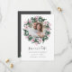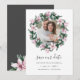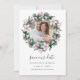 Elegant botaniskt sparar datumet ett favoritfoto av förlovningen omgivet av en rund krans av rosa magnolia blommor och eukalyptus löv i en vattenfärgpalett av rosa och grönt i elegant. Kortet är omvänt i en rik mörk grått med koordinerande blommor. Anpassa med namn, datum och plats för bröllop. Andra färg finns tillgängliga