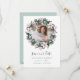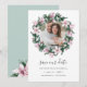 Elegant botaniskt sparar datumet ett favoritfoto av förlovningen omgivet av en rund krans av rosa magnolia blommor och eukalyptus löv i en vattenfärgpalett av rosa och grönt i elegant. Kort bakåt i en grönt för rik med koordinering av blommor. Anpassa med namn, datum och plats för bröllop. Andra färg finns tillgängliga