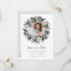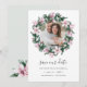 Elegant botaniskt sparar datumet ett favoritfoto av förlovningen omgivet av en rund krans av rosa magnolia blommor och eukalyptus löv i en vattenfärgpalett av rosa och grönt i elegant. Kortet är omvänt i rik silver grått med koordinerande blommor. Anpassa med namn, datum och plats för bröllop. Andra färg finns tillgängliga