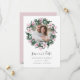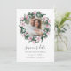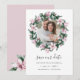 Elegant botaniskt sparar datumet ett favoritfoto av förlovningen omgivet av en rund krans av rosa magnolia blommor och eukalyptus löv i en vattenfärgpalett av rosa och grönt i elegant. Kortet är omvänt i en rik mjuk rosa med koordinerande blommor. Anpassa med namn, datum och plats för bröllop. Andra färg finns tillgängliga