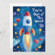 Det här lekfulla hjärt-dagen-kortet är designat för att fånga rymdens under på ett roligt och livfullt sätt. Framsidan på det 5"x7" stora kortet visar en färgglad raket som skjuter iväg in i en stjärnfylld blå galax, omgiven av skinande gyllene stjärnor, fantasifulla planeter och fladdrande röda hjärtan. Det glada budskapet "Du är helt fantastisk!" tar center scenen och bidrar till kortets kosmiska charm.