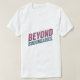 T-shirt-designen innehåller frasen "bortom gränserna" i fet, kontrasterande färg av stark rosa och mörk blått. Texten visas tydligt på skjortan, med fokus på ord. Det färg som används är vibrerande och öga fångar, skapar utformningen.