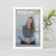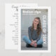 Utexamens tillkännagivande med ditt foto på en enfärgad vit bakgrund (Text och bakgrund är helt anpassningsbara så gör det till ditt eget.) Lägg till ditt namn, skola och examensdatum på framsidan. Baksidan av kortet är fylld med information om dina gymnasieår, dina prestationer och dina planer för framtiden.