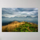 Kvinnor står på berget med vacker grönt och gult barr med grumligt himlar och berg bakom Kobilja Glava, Slovenien.