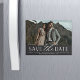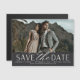 Ett modernt spara datum magneter-designat för att rymma ett enda foto av vågrät- eller landskapsinriktad förlovning. "Spara datumet" visas nedanför i chic block och skriptbokstäver, med namn, bröllop datum och bröllop under, tillsammans med webbplatsen för bröllop eller ytterligare information.