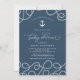 Våra inbjudningar till babyduschen i chicen vid kusten i hamnblått har vita nautiska rep som är beskrivna med en frakts ankarillustration. "En liten sjöman är på väg" visas ovanför dina babyduschdetaljer i nautisk stil-skrift.