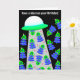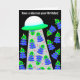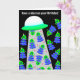 Ha en explosion på din födelsedag! Vi hoppas att det är ur världen! Illustration är ett rymdskepp med en strålningsljus och 19 små utomjordingar. en målmottagare som är 5 år eller äldre.