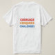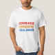 Skriva en kort-beskrivning av t-shirt-designen för bilden av "Courage Conquers Challenges".