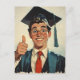 Ett dynamiskt och glatt exempel på en ung man i student som bär ett klassiskt akademiskt tak och en gåva, som utstrålar entusiasm med ett stort leende och en självsäker tumme. Den sjudande konsten fångar upphetsningen från studenten, skapar den perfekt för utbildningsrelaterade teman, framgångshistorier och motiverade innehåll.