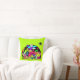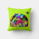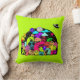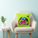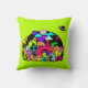 En kudde med en rolig klotter med ett kosmiskt tema. En samling utomjordiska rymdvarelser. Satt på en yttre rymd-design. Du kan se en måne, planeter, zoomande rymdskepp, stjärnor och ett utomjordiskt skepp som kommer in för landning. Färgerna inkluderar både neonljusa och subtila retro-pasteller. Satt på en spännande limegrön bakgrund.