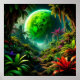En surrealistisk scen med en frodig utomjordisk djungel under en fantastisk grön planet. De livfulla färgerna och exotiska växterna skildrar en fantasifull, drömlik miljö som frammanar äventyr, utforskning och mysterierna i utomjordiska miljöer.