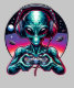 Främmande varelse som spelar videospel med hörlurar på sig och kontroller i handen. Färgrik utomjordisk AI-konst.