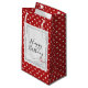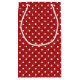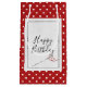 Syning av nål med tråd och svart sytt ram på rött och vitt polkattfylleri. Text kan redigeras.