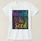 T-shirt har en fetstilt och öga-fångstdesign med texten "Wealth is the Seed" på framsidan. Texten är en pulserande övertoning för flera färg, där varje ord har en annan ton som representerar de olika sätt på vilka rikedomarna kan växa och blomstra. Den övergripande utformningen är enkel men opraktisk och lämnar gott om utrymme för att budskapet ska skina.