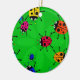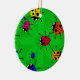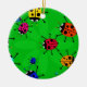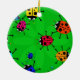 Färgglad illustration av en svärm av färgglada tecknadnyckelpigor som omkring rusar på en grön bakgrund. Avbilda tillgängligt på olika gåvor och produkter.