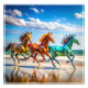 Galloping av flerfärgade glashästar på en Poster persika | Vibrant Summer Wall Art. Ta med dig konstens skönhet och elegans till ditt rum med den här bedövande poster som innehåller tre flerfärgade glashästar som gallrar ner en sandstrand på en varm sommardag. Glashästarnas pulserande färg och dynamiska rörelse skapar en fängslande scen, blandande natur och kreativitet på ett unikt sätt. Perfekt som murkonst för hästälskare eller någon som tittar att lägga lite färg och energi på hemmet eller på kontoret, framkallar i biet en känsla av frihet och sommartrygghet.