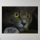 En närbild av ansikte i en grått-katt med gult öga och dilaterade elever, vilande huvudet på tass och intensivt stirrade på något bakom kameran.